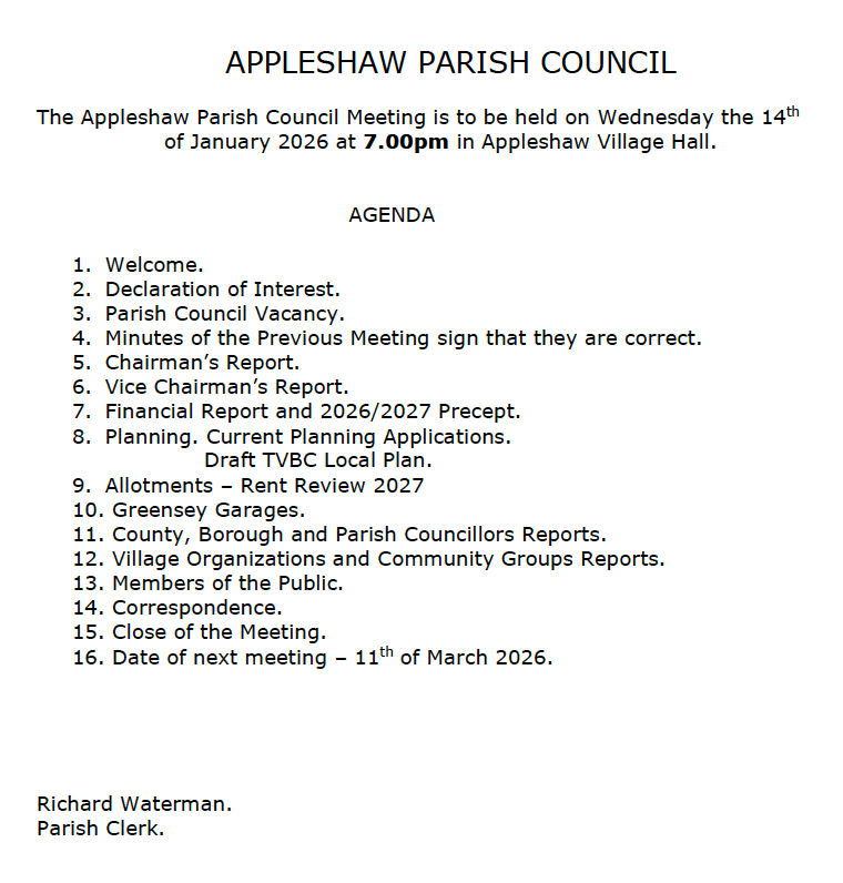 The Parish Council meets at 7.00 pm on the first Wednesday of the month in Appleshaw Village Hall