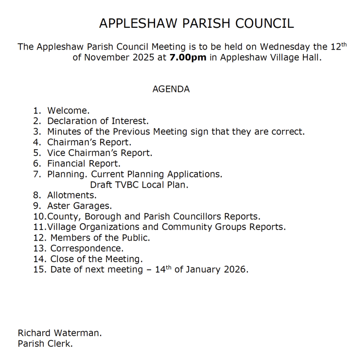The Parish Council meets at 7.00 pm on the first Wednesday of the month in Appleshaw Village Hall